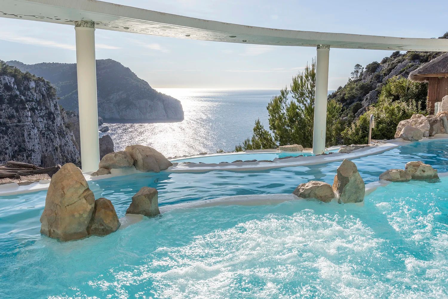 The crown jewel of Hacienda Na Xamena is undoubtedly the Cascadas suspended pools. This series of three interconnected infinity pools appears to spill down the clifftop in defiance of gravity, each level offering a different perspective on the Mediterranean below.